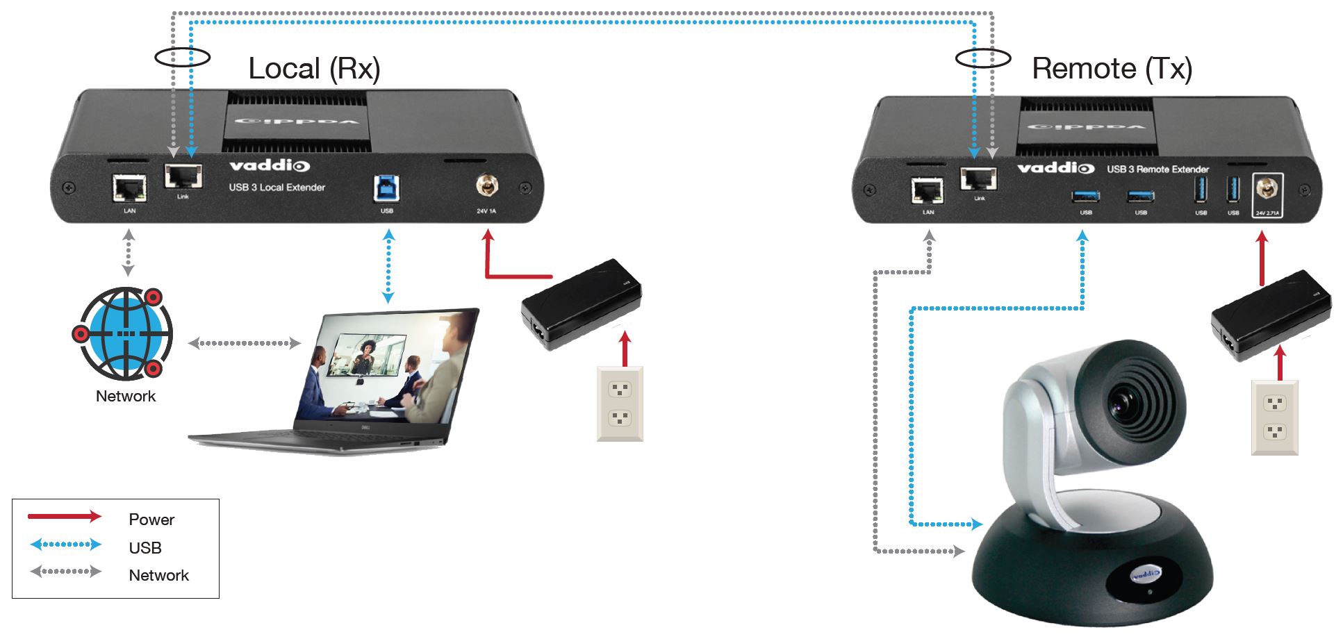 The Vaddio USB 3 Extenders enable you to extend USB 3.1 beyond the standard 3m cable limit for USB 3.1 peripheral devices (like a camera or other av source). This extender system is composed of two individual units, the Local Extender and the Remote Extender.