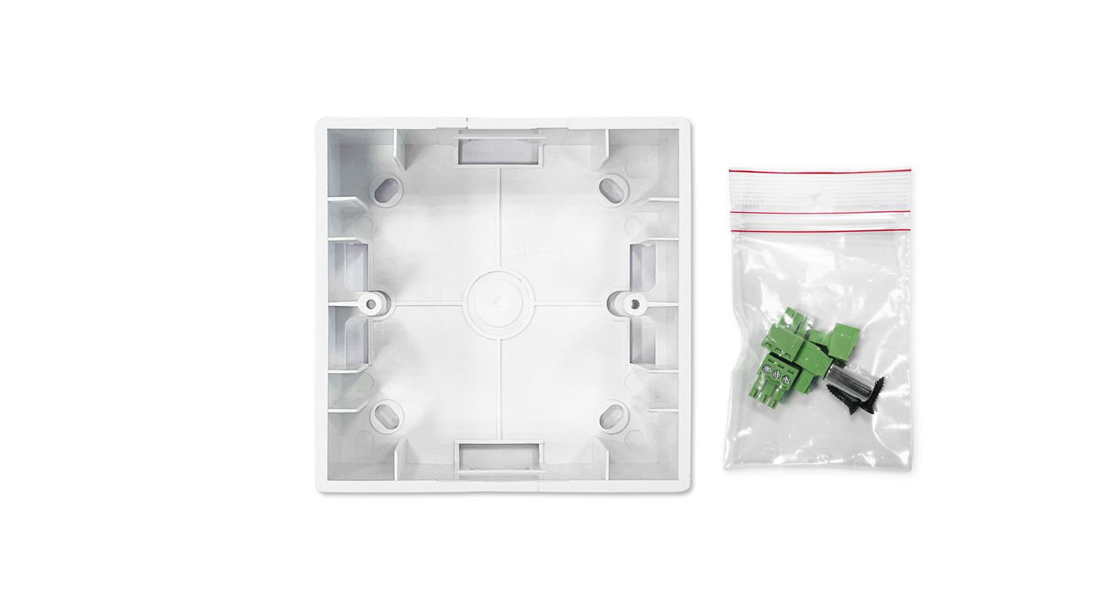 - Euroblock connectors, Surface mount box, Warranty card, Getting started card, Magnet and Screws