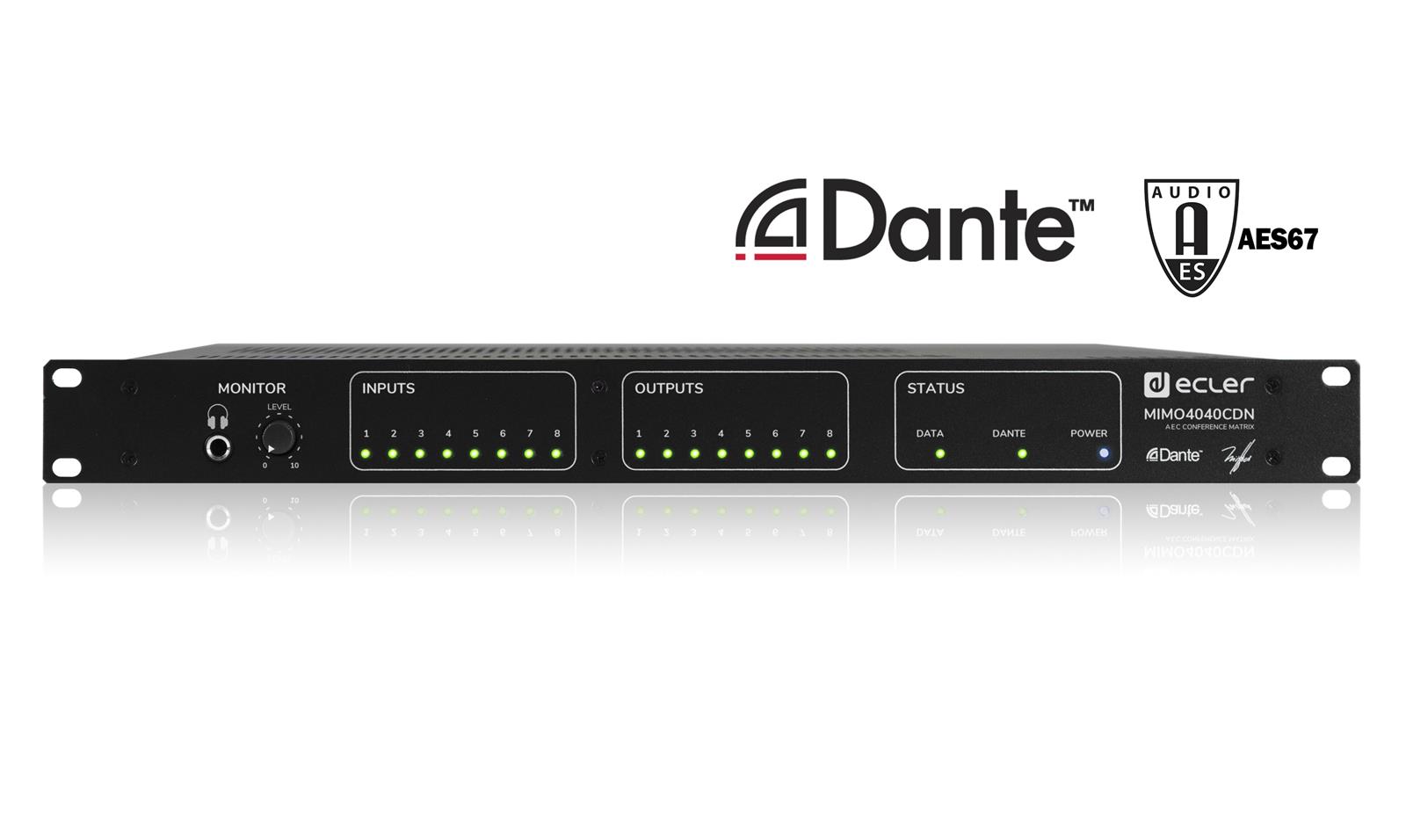 MIMO4040CDN is is a digital audio matrix including a native (full DSP) matrix of 40x40 input and output audio channels total size, specially designed for conference rooms. It includes functions such as AUTOMIXER or FEEDBACK KILLER by default, as well as up to 8 microphone channels with AEC (Acoustic Echo Canceling) processing activated by software licenses.