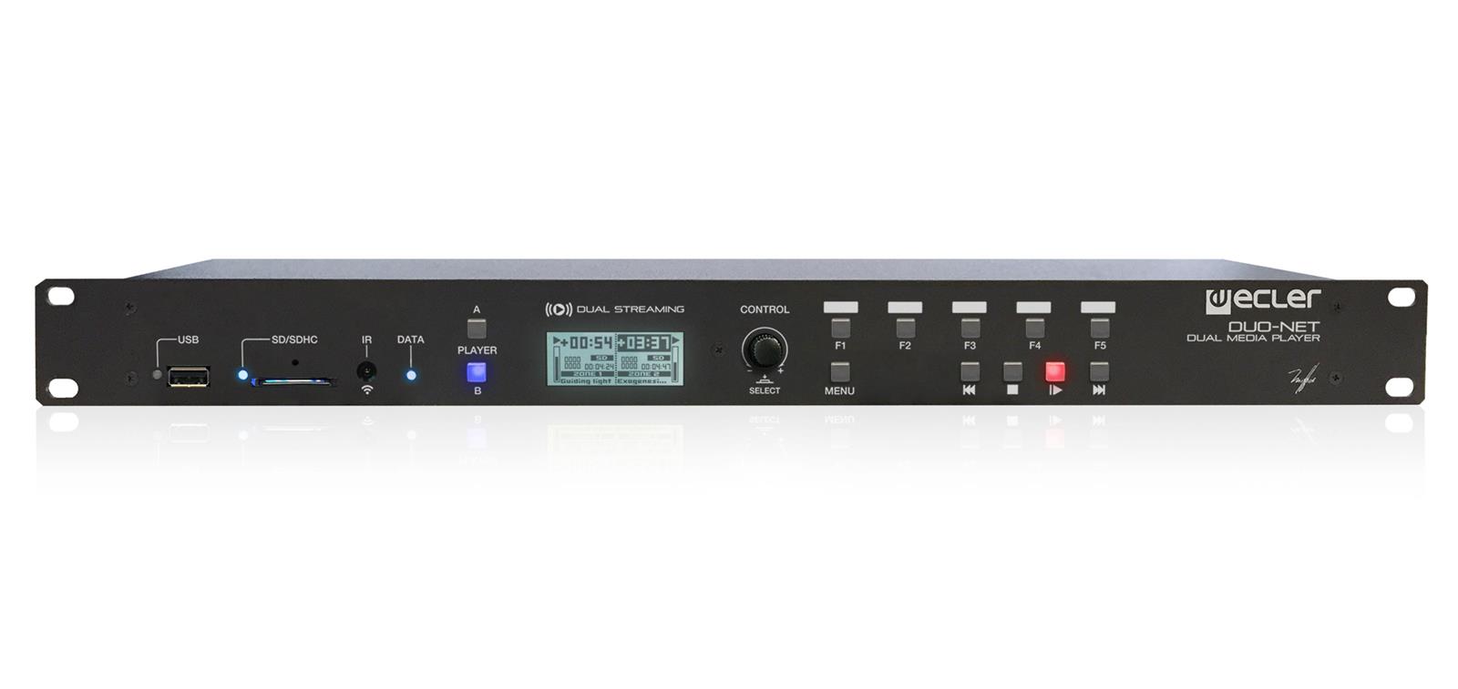 DUO-NET PLAYER is a double audio sound source that features full EclerNet compatibility (EclerNet Manager software, UCP control system, WPNETTOUCH remote management, TP-NET third party integration protocol, etc.). It includes 2 independent stereo media players, each one being able to play Internet audio streams and local or networked audio media. DUO-NET PLAYER can be used as a stand-alone media player or integrated as a piece of a full EclerNet system, as well as coexisting with third-party devices.