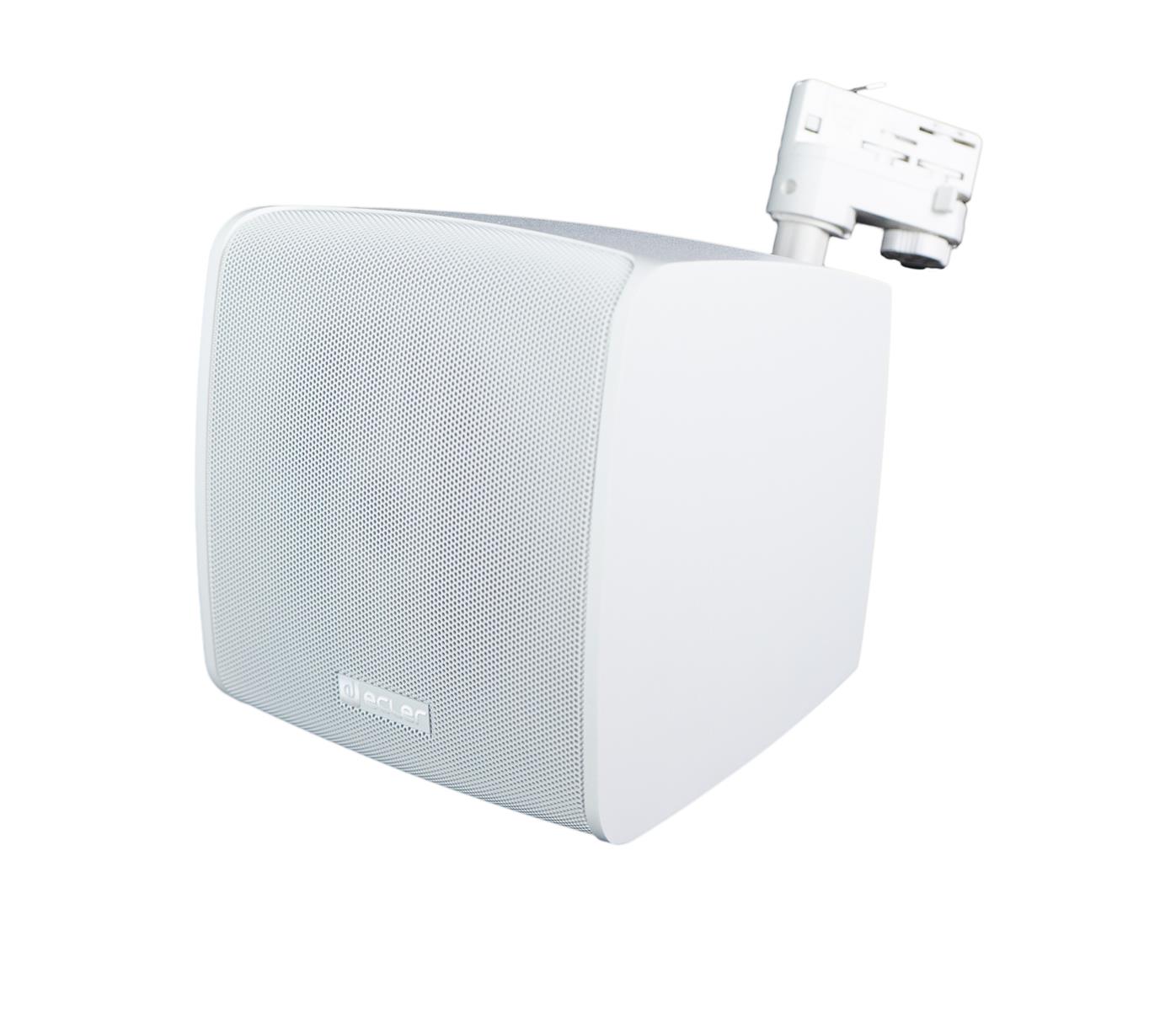 WiSpeak CUBE is a self-powered 5" loudspeaker cabinet with wireless audio reception and control capabilities under the control of the Master unit, featuring an installation system which is compatible with ceiling light rails. Alternatively, wall mount or desktop installation is as well possible by means of the included accessories.