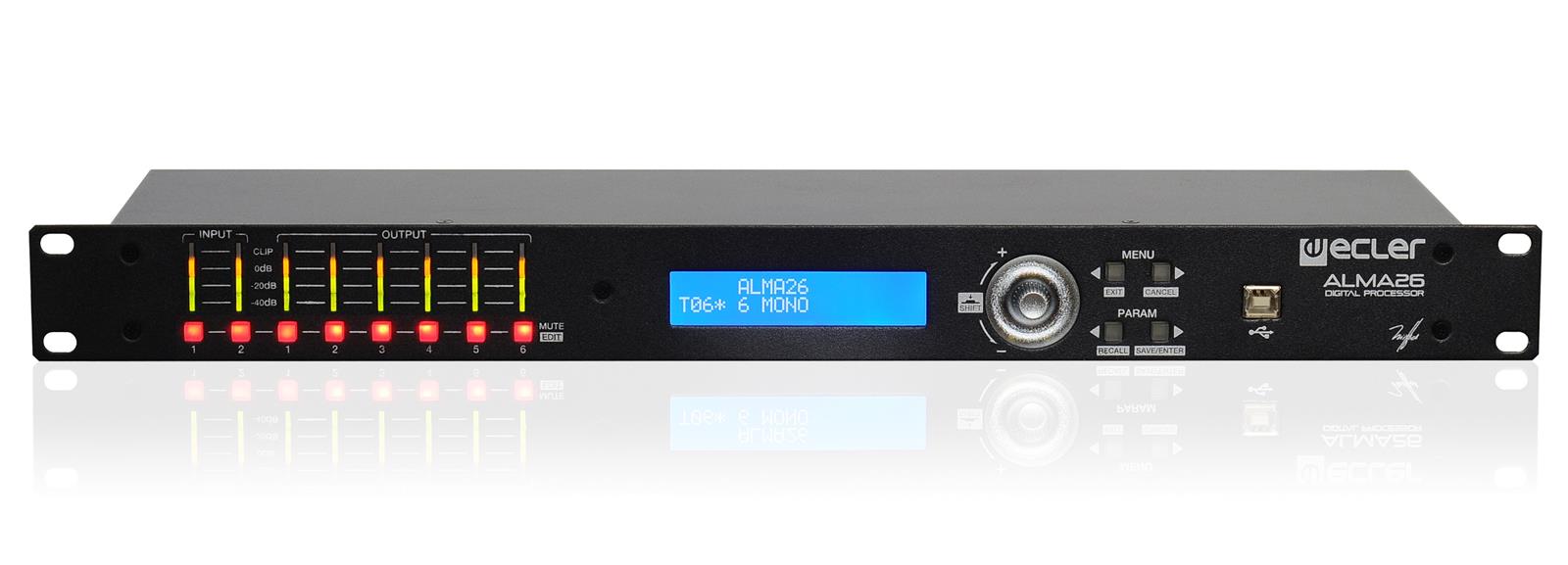 ALMA26 is a digital loudspeaker manager including 2 audio inputs and 6 audio outputs, USB interface and 2 volume remote control ports (0-10VDC).