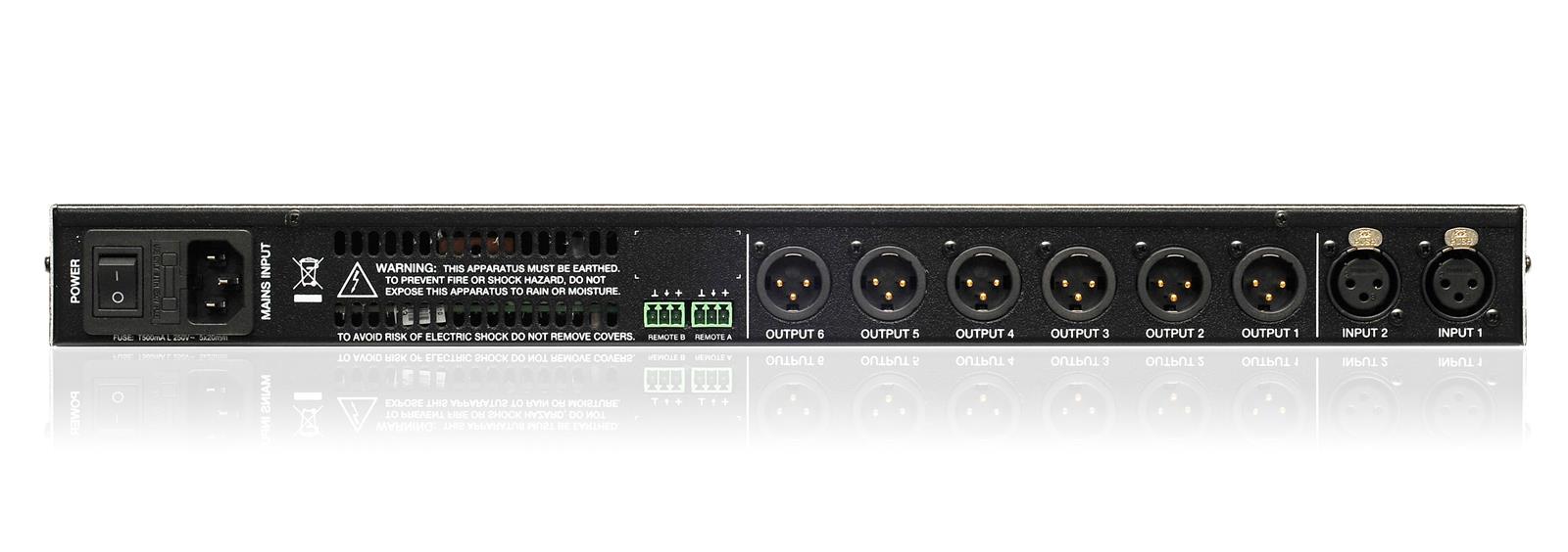 - 2 audio inputs x 6 audio outputs, all balanced