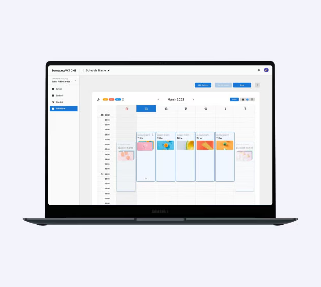 Samsung VXT uses an intuitive drag and drop interface, making content scheduling and playlist creation simple with just a few quick clicks. It also allows for adjusting content schedules and distributing them to connected displays anytime, without requiring a PC.