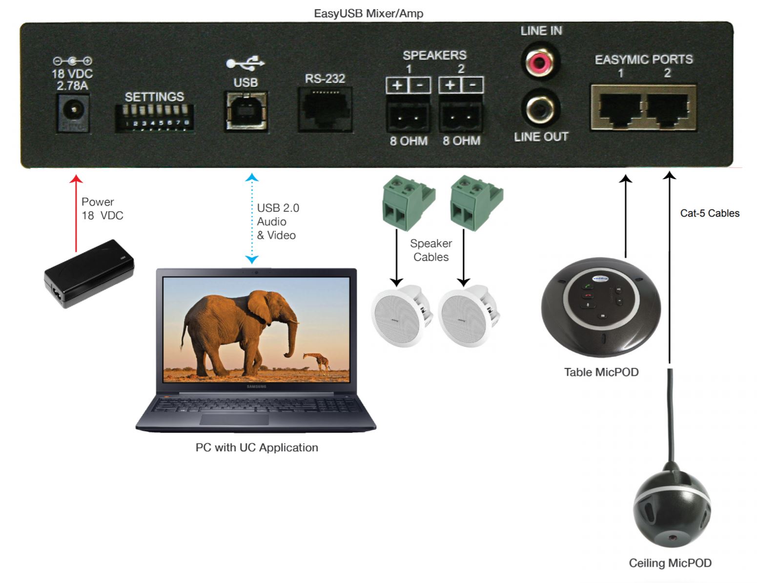 - Supports up to two EasyMic Devices (MicPOD or Ceiling MicPOD) using RJ-45 & Cat. 5 for audio, control, and power (100 feet)