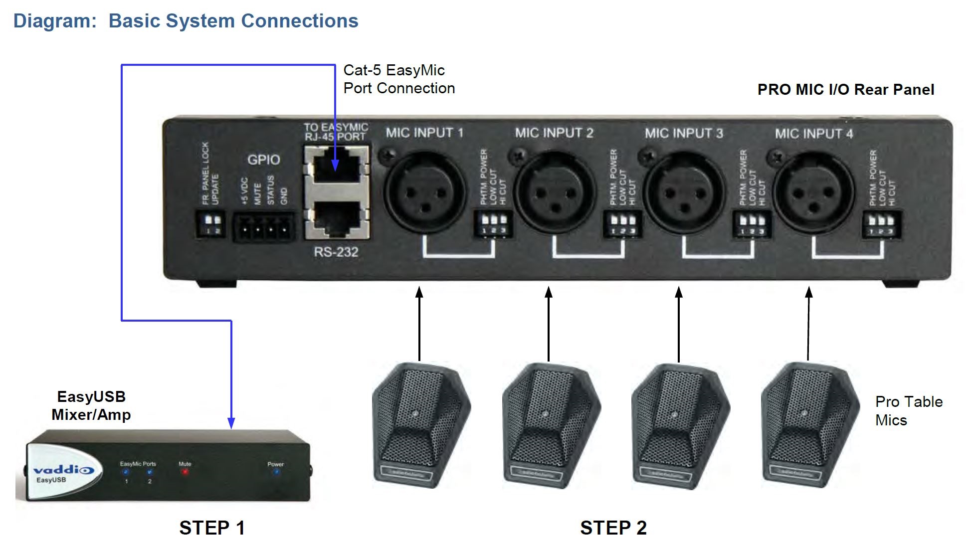The PRO MIC I/O comes equipped with four independent echo cancelation microphone inputs and one discreet output for interfacing to the Vaddio EasyUSB Mixer/Amp. The system can be expanded to support eight microphones by adding an additional PRO MIC I/O.