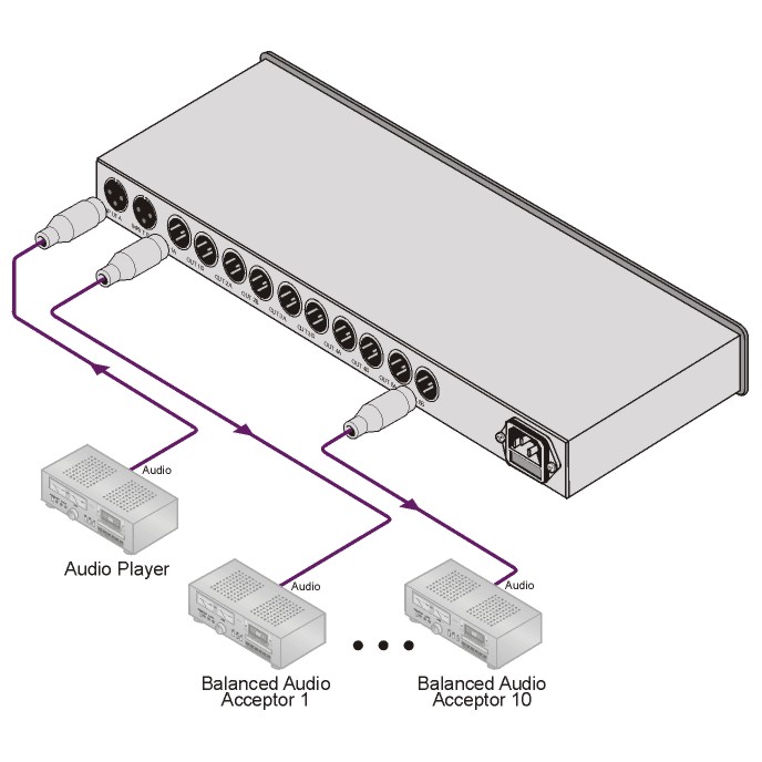 The VM-1110xl is a high-performance distribution amplifier for balanced mono audio signals on XLR connectors. It can also be configured as a 1:5 distribution amplifier for stereo balanced audio signals.