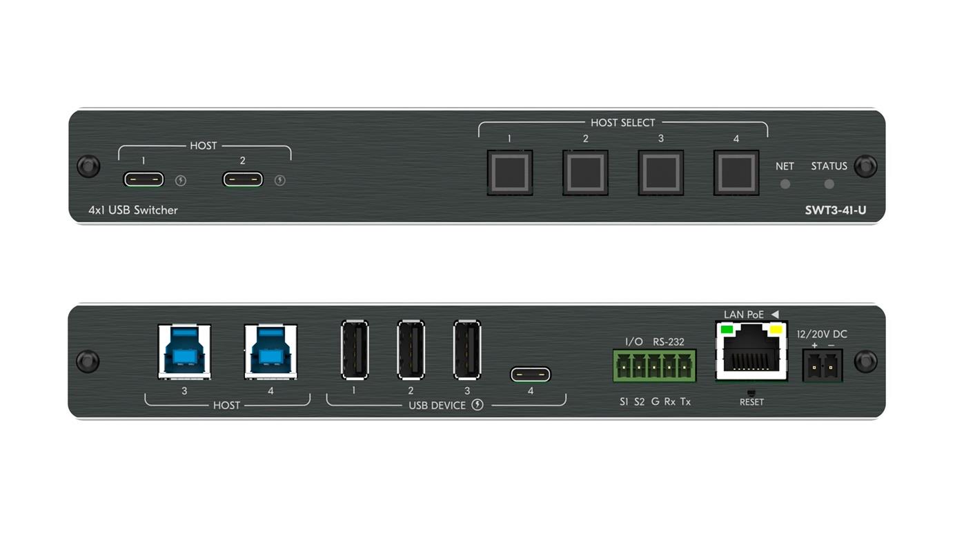 SWT3−41−U is a high−performance switcher with two USB−C and two USB−B ports for USB host devices connection and plug and play host user auto−switching experience based on active USB signal detection. The four connected USB peripherals, such as a room camera and microphone, are switchable for use of the active USB host, for convenient online meeting participants operation.
