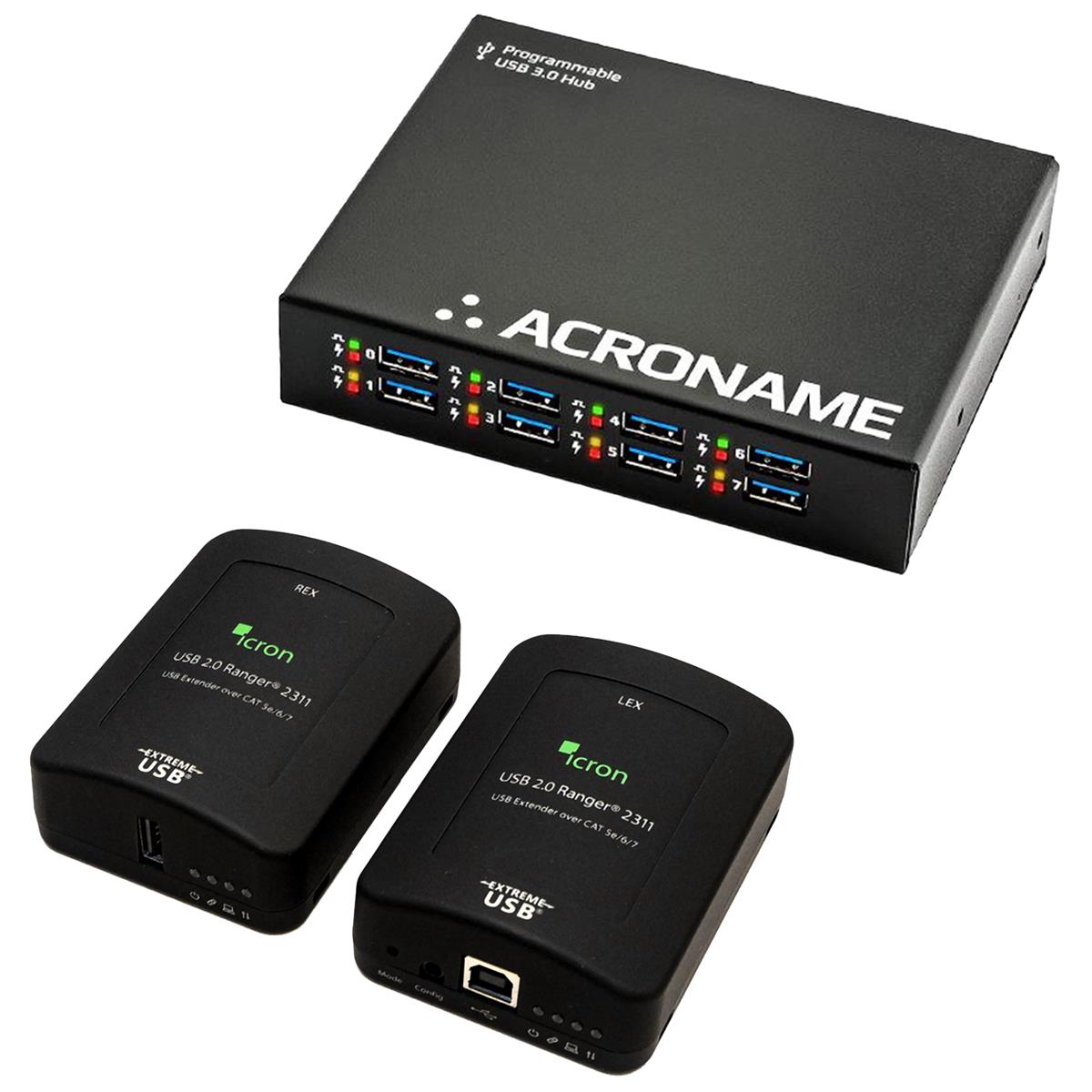 - Local Extender (LEX) module, Remote Extender (REX) module, USB Type A-B cable 1,8m, Quick Start Guide, Power supply w. cord, Acroname 8-port USB 3.2 hub, 2 USB 3.0 Type A-B cable 0,9m, Power adapter w. cord