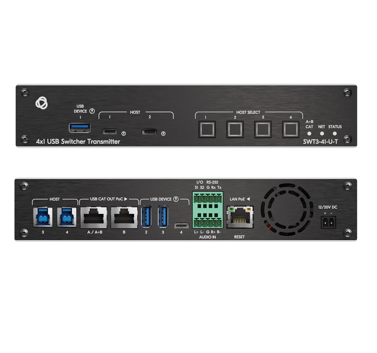 SWT3−41−U−T is a high−performance switcher transmitter with two USB−C and two USB−B ports for USB host devices connection and plug and play host user auto−switching experience based on active USB signal detection. The local and remote (over CAT−links) connected USB peripherals, such as a space camera and microphone, are switchable for use of the active USB host, for convenient online meeting participants operation.
