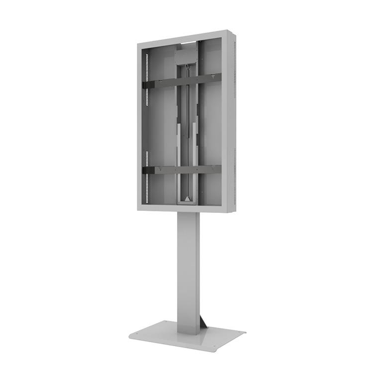 Our new updated HI-ND floorstand glass has an adjustable height allowing for adjustments of 40 cm. The spring feathers makes it very easy to adjust the height of the stand even when the screen is installed. It is designed to be used with 43″, 46″, 49″ and 50″ displays. Cables, computer and powersockets can be hidden in the pillar. It is perfect in store entrences with limited space.