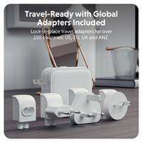 Interchangeable travel adapters for over 150 countries (US, EU, UK and ANZ) are included, eliminating the need to carry additional converters. Our adapters securely lock into place, providing a more secure solution than adapters that slide over the US plugs.