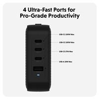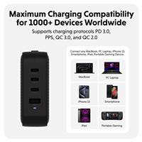 - Can power up to 4 devices simultaneously with its three USB-C ports and one USB-A port