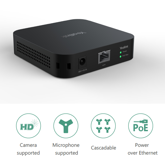 The RCH40 also comes equipped with Yealink EasyConnect, user can connect the RCH40 to the Yealink VCH port without a power adapter, simplifying your cable connection.