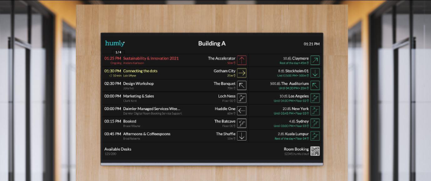 Just like the airport departure board shows a list of flights in chronological order, list your meeting room status. Ongoing meetings show at the top, followed by meetings that are about to start. Further down meetings later in the day can be found.