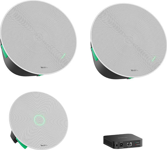 The Yealink CMKit-121 is a comprehensive package designed as the core setup for the Yealink audio ceiling solution. It includes the CM20 ceiling microphone, a pair of CS10 ceiling speakers, and an RCH40 E2 switch.