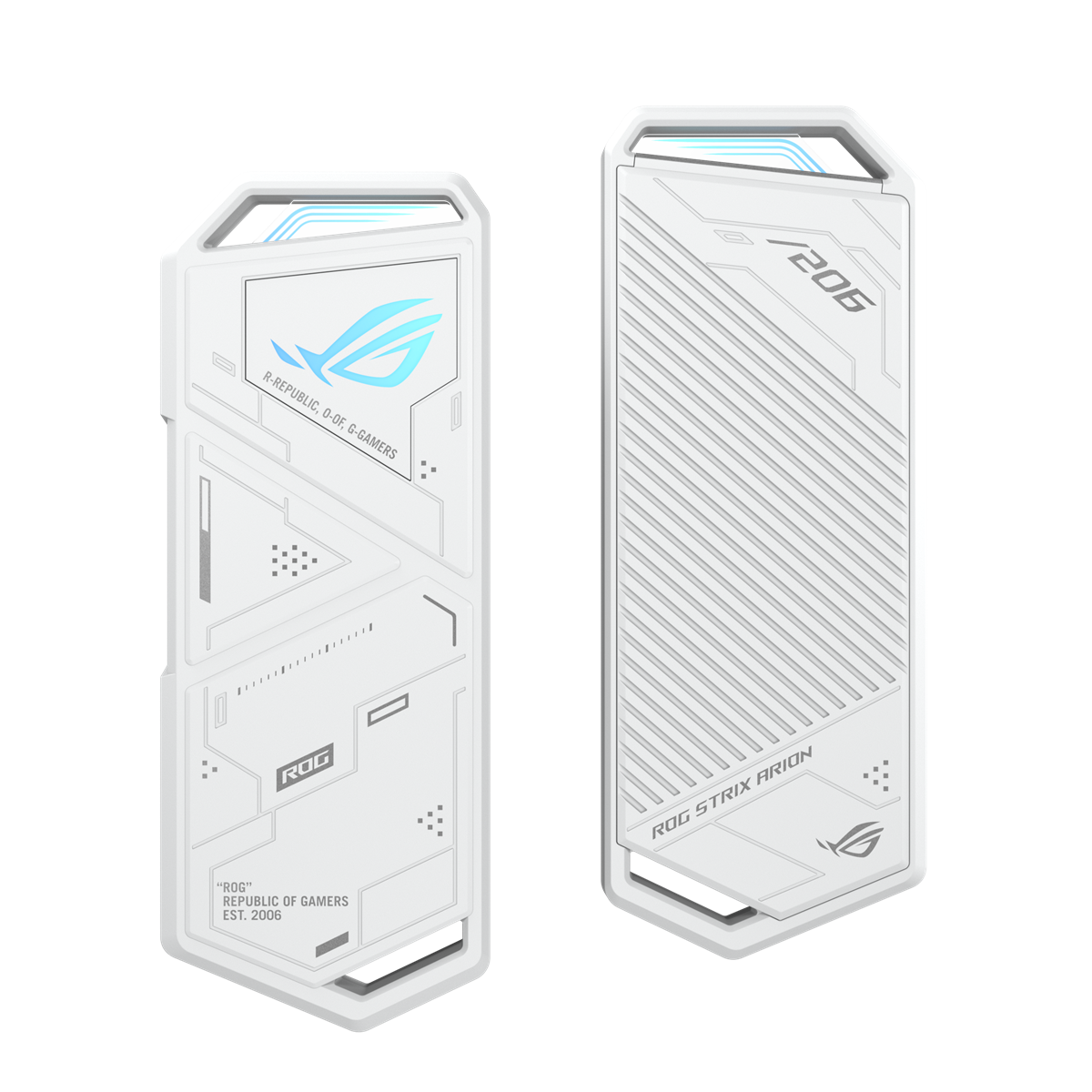 ROG Strix Arion is an SSD enclosure that fits an M.2 PCIe NVM Express® SSD with a 2230/2242/2260/2280 form factor and features USB-C™ 3.2 Gen 2x1 connectivity to deliver data transfer speeds of up to 10 Gbps. Its sleek aluminum alloy case features thermal pads for excellent heat dissipation, exclusive ASUS Aura Sync lighting effects, and a protective holder with an R-hook that altogether make ROG Strix Arion a high-performance, mobile storage solution.