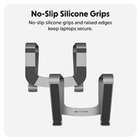 The HyperSpace Ergonomic Laptop Stand elevates your laptop 5.6 inches off your desk, which is within the recommended ergonomic standard and the perfect angle for typing and viewing. This fixed height stand has been designed to hold all laptops up to 16” in size, and features a sturdy, aluminium design with non-slip silicone grips on the bottom and arms as well as raised edges to stop the laptop moving and coming off the stand.