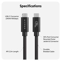 An all-in-one cable solution engineered for speed and power. The HyperDriveNext USB4 Type-C Performance Cable provides 40Gbps data transfer rates, allowing you to move large files in seconds. Its impressive 240W charging power means your USB-C devices* are charged up quicker than you can imagine, while the capability to support 8K video resolution elevates your viewing experience to new heights of clarity and detail. Featuring a durable braided 4ft/1.2m cable that has been made from 35% Post Consumer Recycled (PCR) TPE, as well as universal USB-C compatibility, this is the ideal solution for all your connectivity needs.