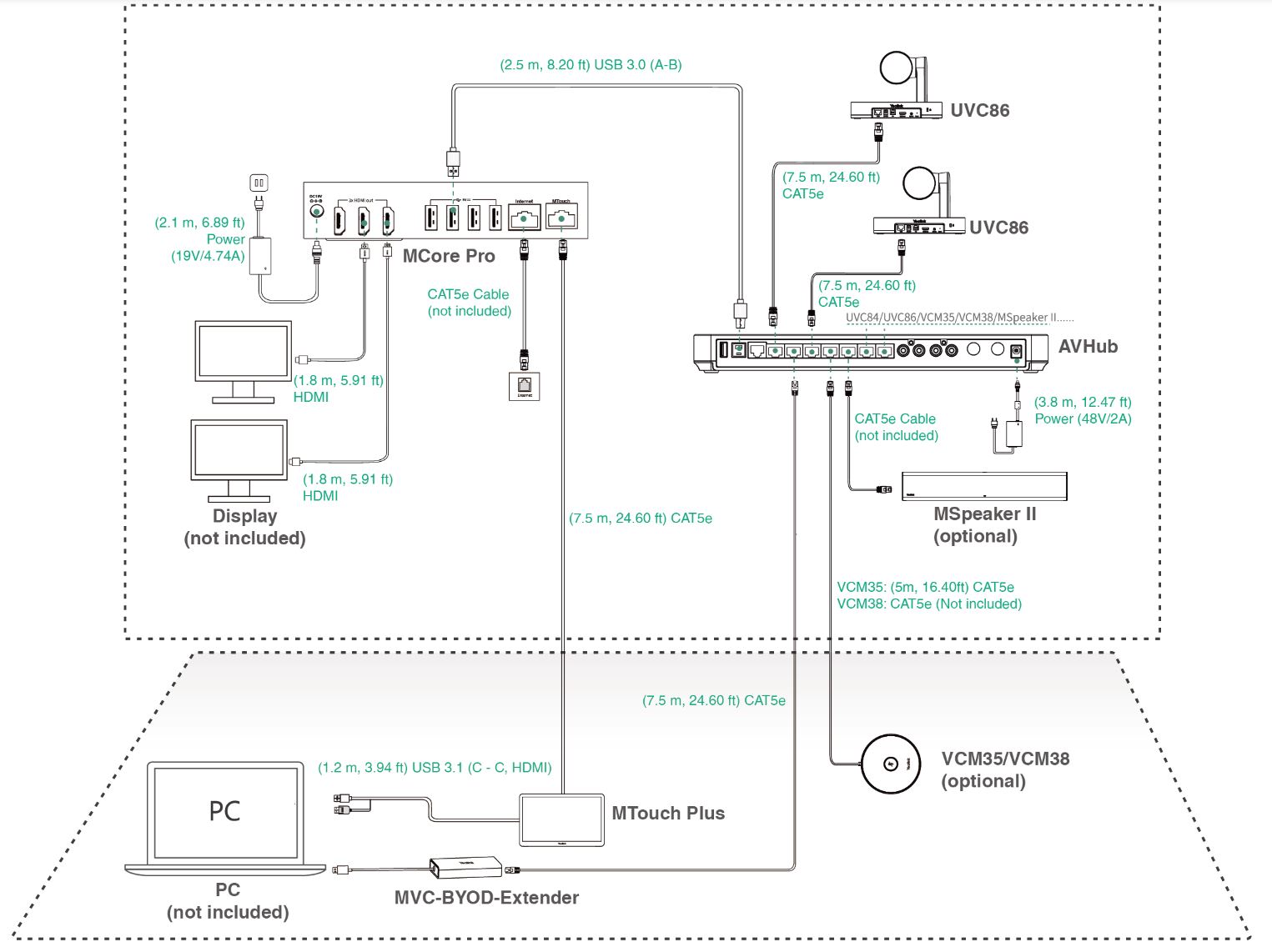 - Mini-PC: Input: 19V, 4.74A, UVC86 camera via power adapter (included), AVHub via power adapter (included)