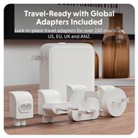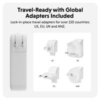 Interchangeable travel adapters for over 150 countries (US, EU, UK and ANZ) are included, eliminating the need to carry additional converters. Our adapters securely lock into place, providing a more secure solution than adapters that slide over the US plugs.