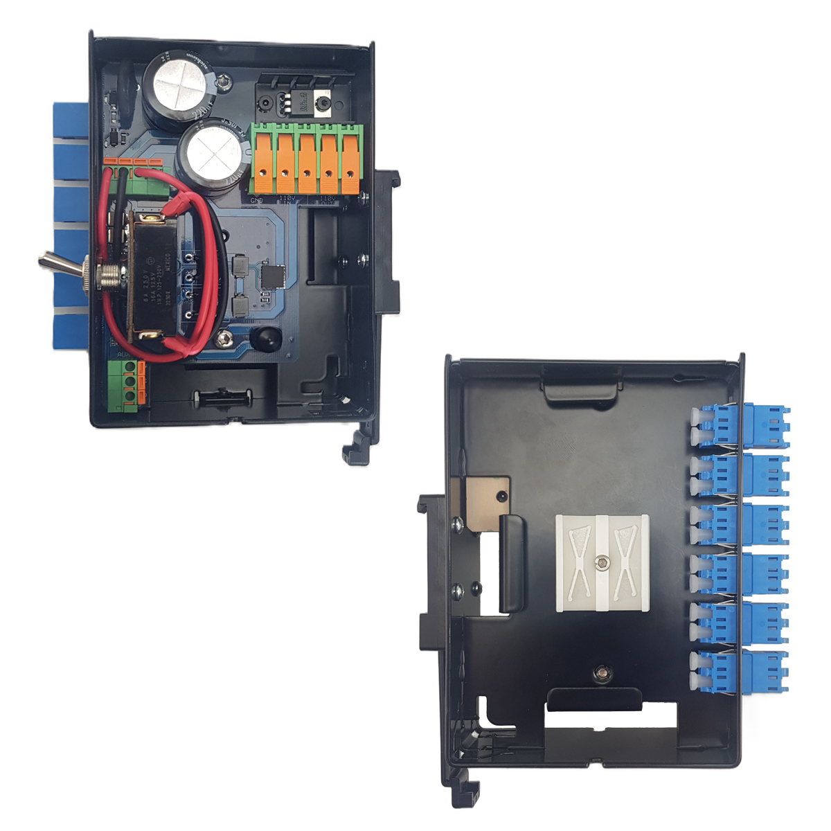 Premounted LC duplex blue adapters and holders for splice protection sleeves enables secure termination to pigtails. Power wires from Micro hybrid cable are terminated to push-lock connectors. The unit shall be powered with enclosed power cable cord according to the enclosed installation manual. Power inlet is designed with blocking for faulty polarity connection. Blue LED at power inlet indicate correct powering and the green LED indicate power output to the system. Built in voltage and current sensor.