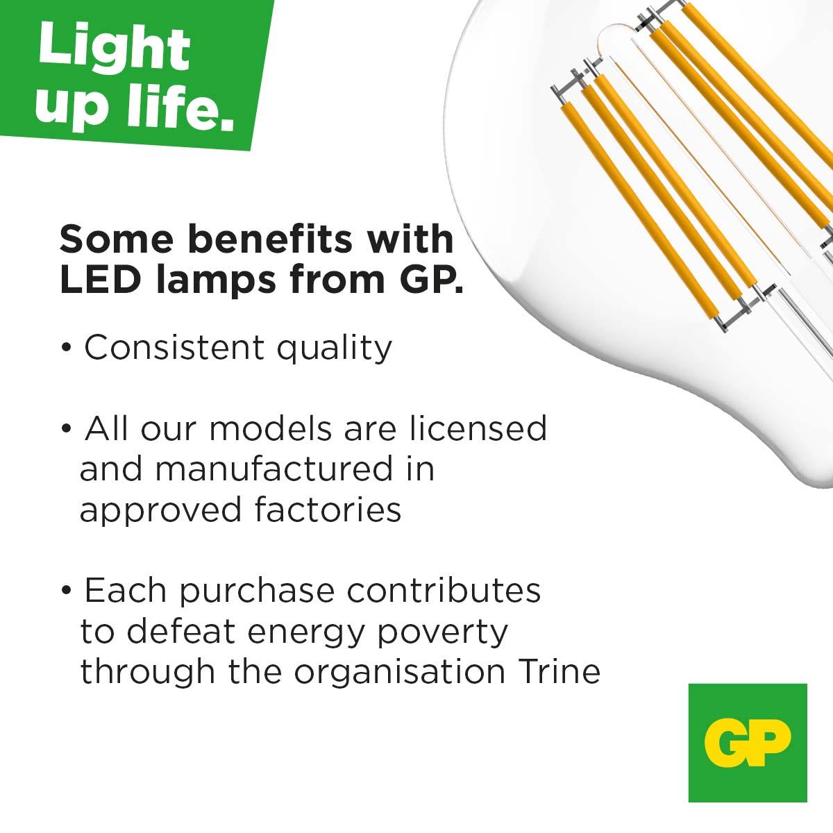 GP LED Filament globlampa ser ut som en vanlig klassisk glödlampa med glödtråd fast med ny innovativ filamentteknik. Med sina tätt packade LED chips som sitter på filamenttråden är de dessutom helt rundstrålande och kan därför med fördel användas där ljuskällan blir helt synlig. Mini Globe passar som accentbelysning för att skapa stämningsfulla ljuspunkter.