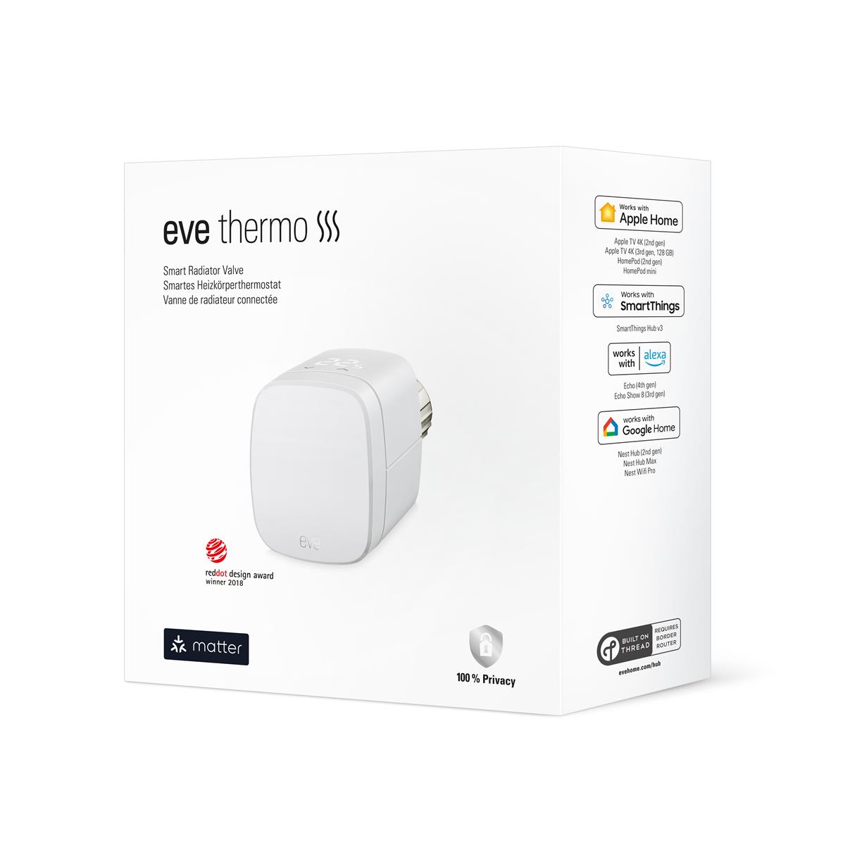Cutting-edge connectivity with Matter and Thread. Requires Eve Thermo (4th generation) upgraded to Matter, and Apple TV 4K (2nd gen / 3rd gen 128 GB), HomePod (2nd gen), or HomePod mini