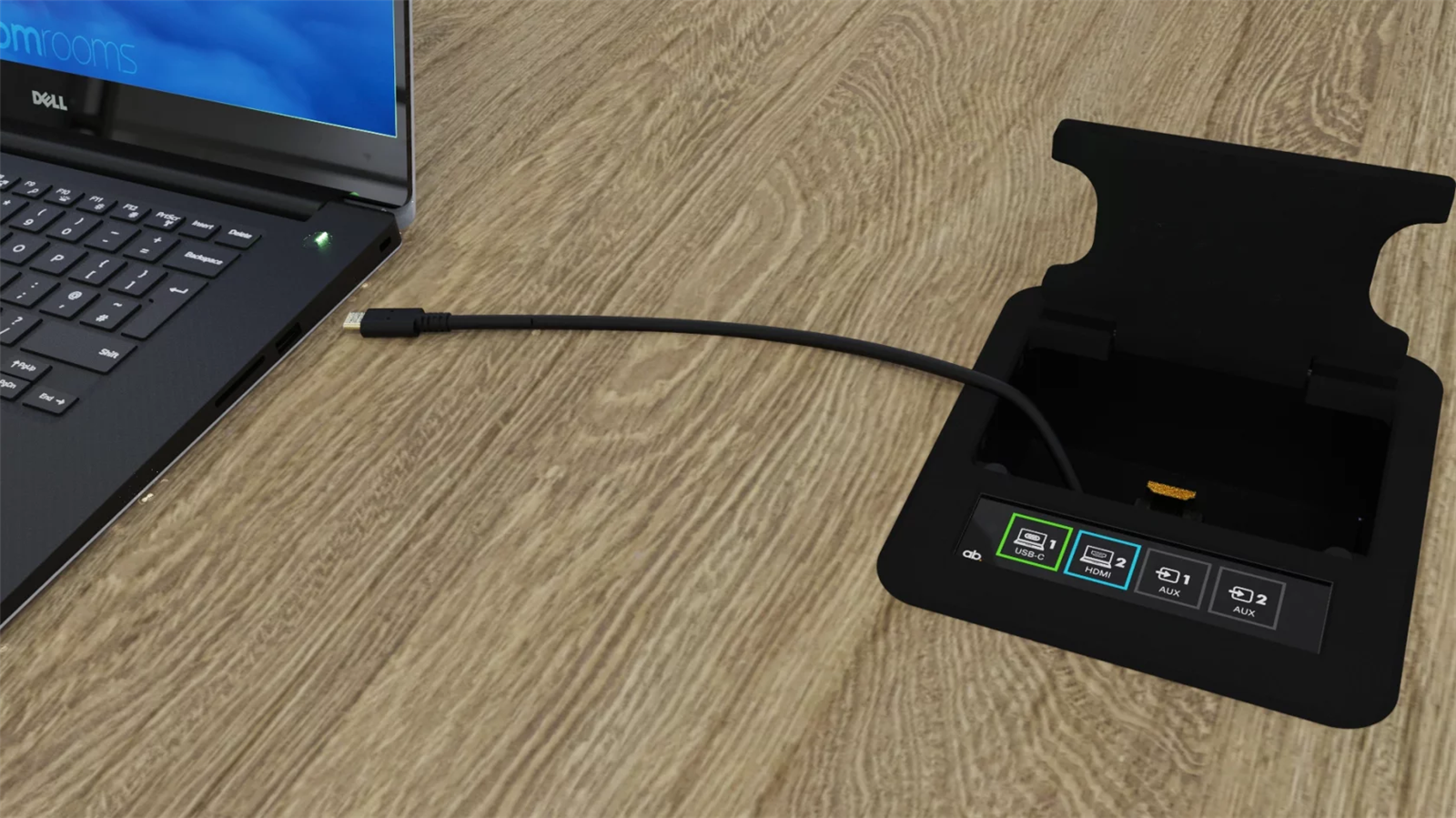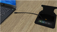 The cable retractor system is a concealed, self-winding cassette which allows easy access to a combination of HDMI or USB-C connectors. Mounted either within the leg structure of the AB furniture range or retro-fit-table in 3rd party tables, the retractors reduce cable clutter and ensure that connectivity is available whenever required.