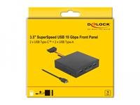 This front panel by Delock can be installed into a free 3.5″ bay of a computer. It has two USB Type-A and two USB Type-C™ ports. It will be connected to the motherboard internally via a USB Type-E Key A male port.