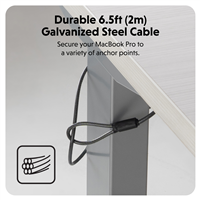 The 6.5ft long cable is built from heavy-duty galvanized steel, offering cut-resistant strength and rust-proof reliability. Its length provides versatility, enabling you to secure your MacBook Pro to a number of different fixed objects.