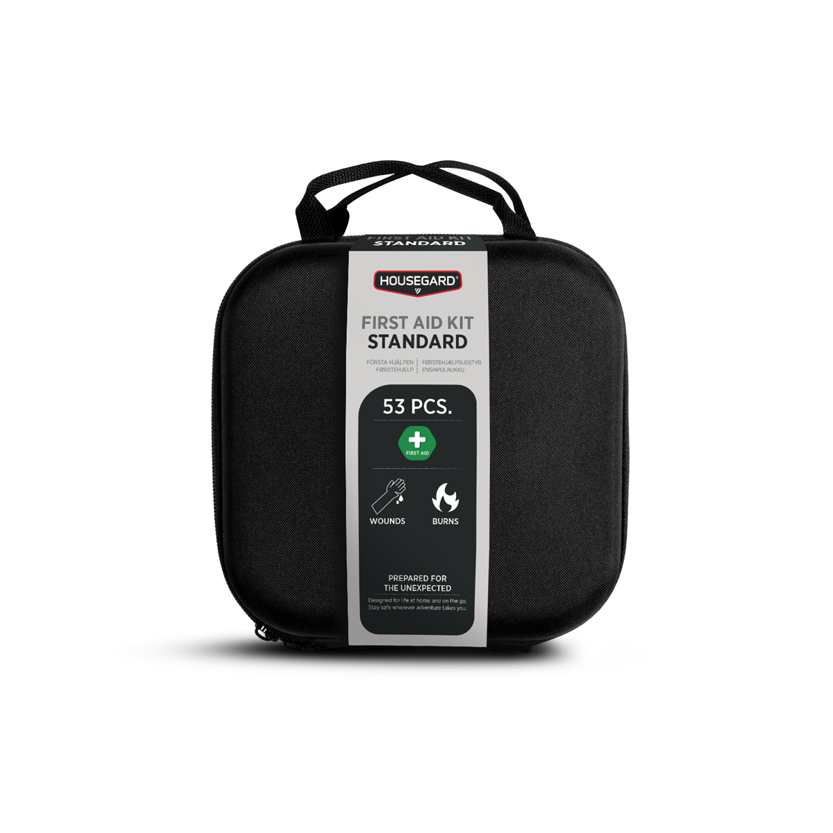Housegard Standard är en genomtänkt första hjälpen-väska anpassad för både mindre och större skador. Med 53 delar får du en bred uppsättning av förbandsmaterial, sårtvätt och tillbehör som kan vara avgörande vid en olycka.