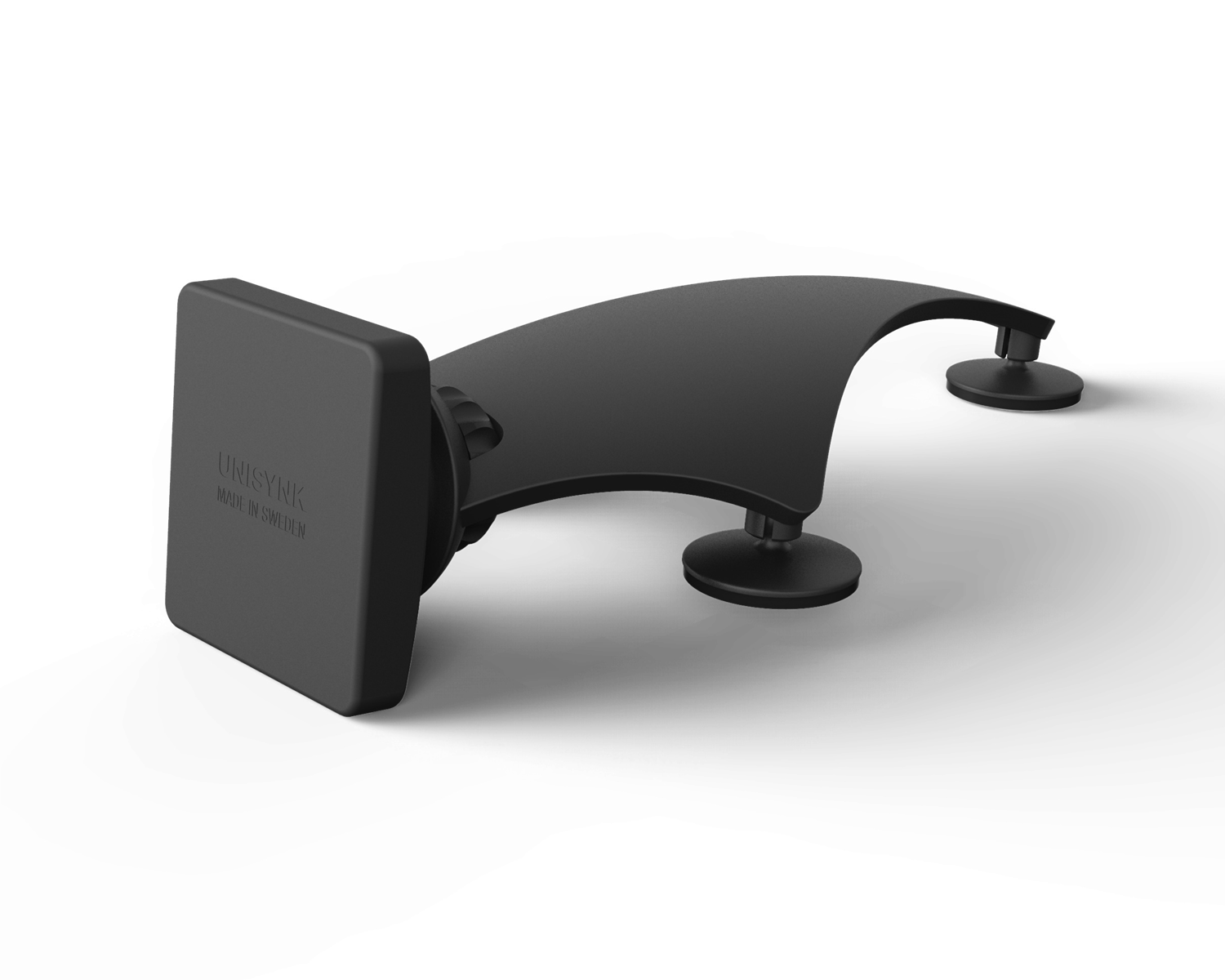 Keep your phone close and secure with this Swedish-made universal smartphone holder. For installation on the dashboard of any car. Attaches easily and strongly to any clean surface and leaves no tape residue if removed. Twin neodymium magnets securely hold any type of phone with the included metal plate attached or with a magnetic phone case. Lockable ball joint for stepless adjustability in rotation and angle. Made of glass fiber reinforced plastic for extra durability.