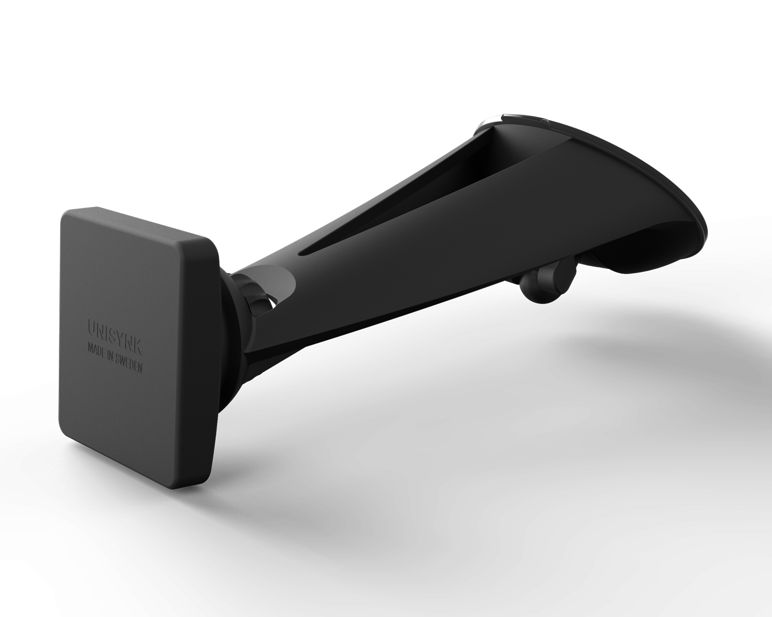 Keep your phone close and secure with this Swedish-made universal smartphone holder. For installation on the windshield of any car. Attaches easily and strongly due to airtight PVC suction cup. Twin neodymium magnets securely hold any type of phone with the included metal plate attached or with a magnetic phone case. Lockable ball joint for stepless adjustability in rotation and angle. Made of glass fiber reinforced plastic for extra durability.