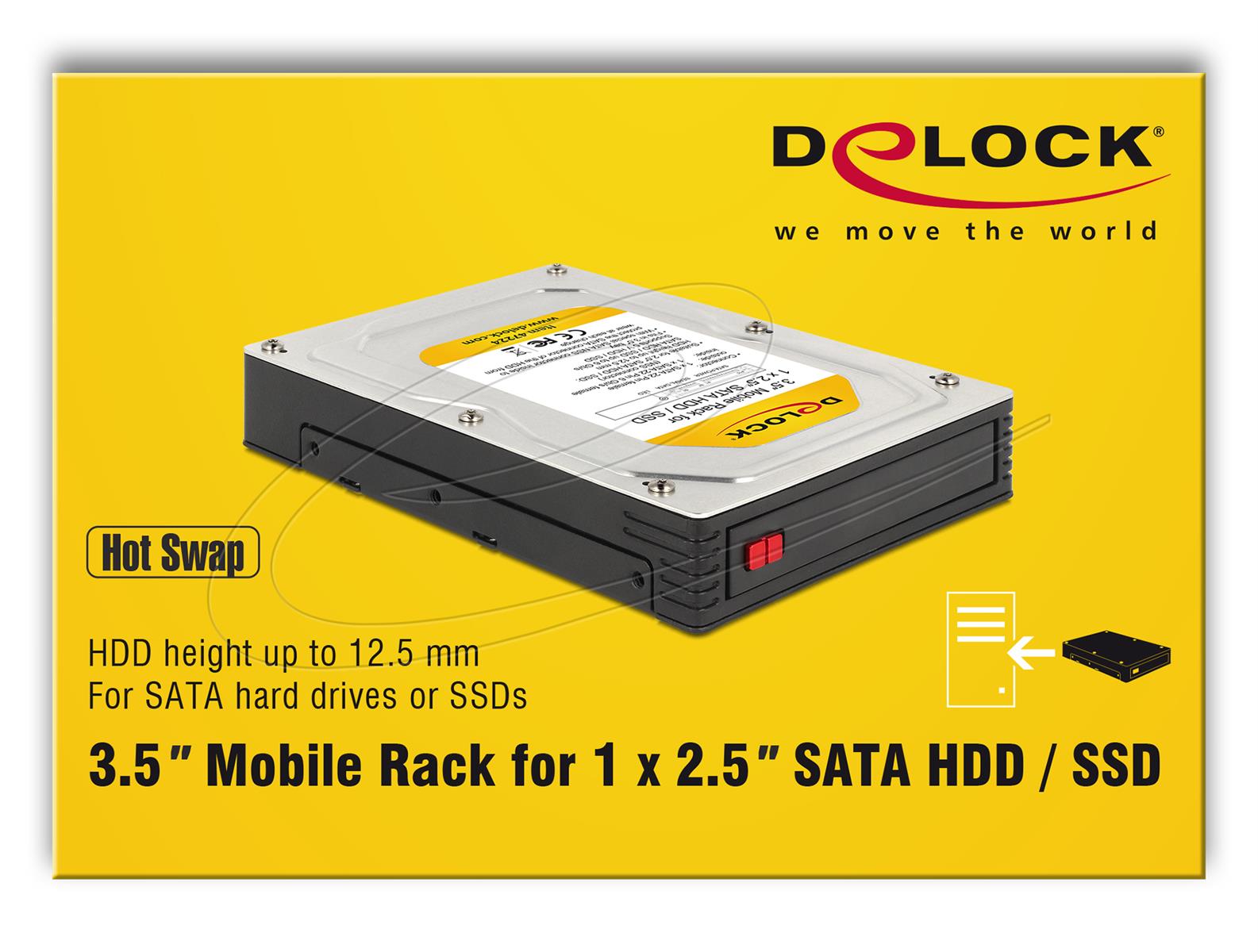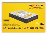 This Delock mobile rack can be used both externally and internally to connect a 2.5" SATA hard drive. Slide the hard drive directly into the rack and connect it to a Power Over eSATA port using an optional cable, or internally to SATA. The rack's size corresponds to that of a 3.5" hard drive. Therefore, you can install it in any 3.5" slot or even in a 5.25" mobile rack.
