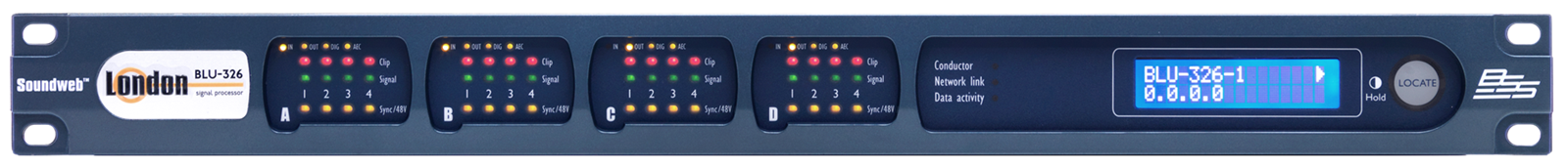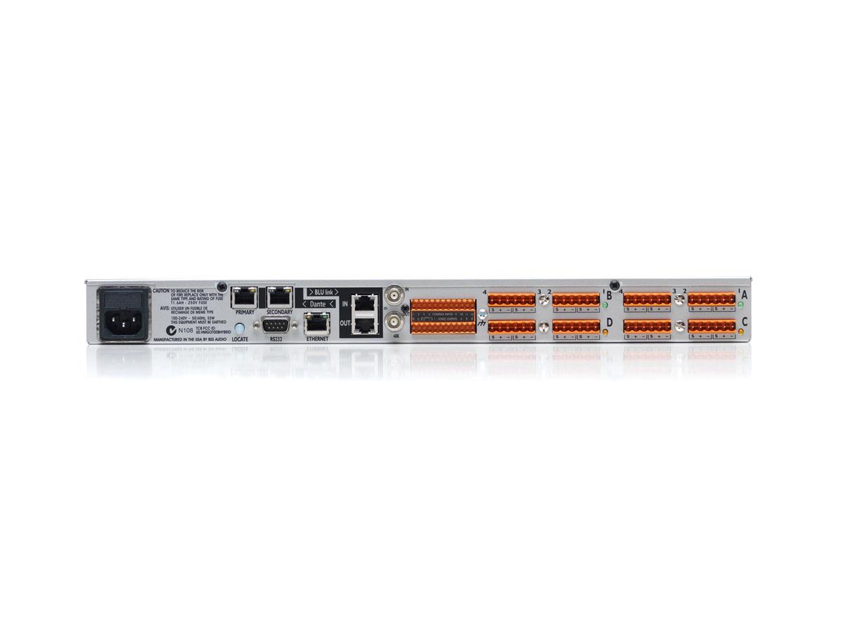 As well, the processor includes support for Dante 4.0 firmware for integration with Dante Domain Manager. The BLU-326DA also features a low latency, fault tolerant digital audio bus of 256 channels which uses standard Category 5e cabling giving a distance of 100m between compatible devices. Fiber optic media converters can be used to increase the distance between devices to over 40km. Four card slots which accommodateanalog inputs, analog outputs, digital inputs and digital outputs in banks of four facilitate many different device I/O configurations.