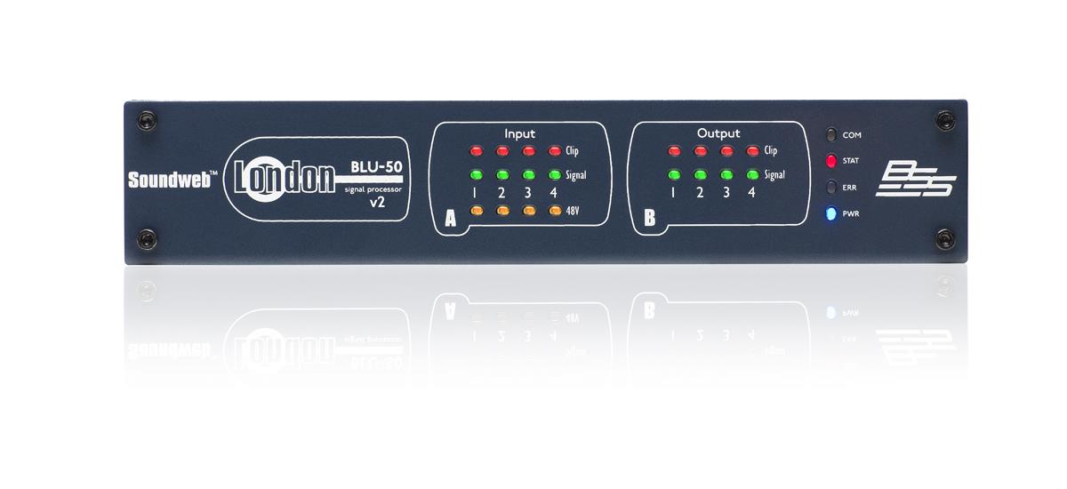 The BLU-50v2 features BLU link, a low latency, fault tolerant digital audio bus of 48 channels, which uses standard Category 5e cabling giving a distance of 100m between compatible devices. Fiber media converters can be used to increase the distance between devices to over 10km (6.2 miles) using single mode fiber.