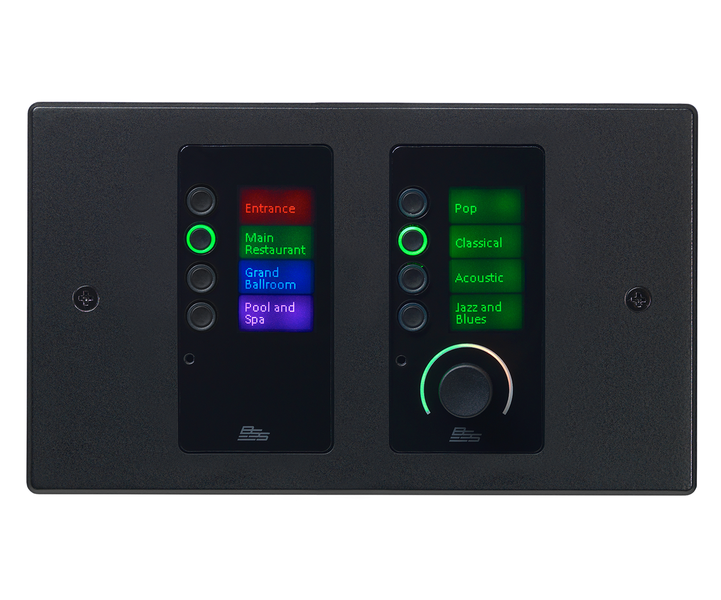 The EC-8BV contains one push/rotary encoder, one encoder ring, eight buttons, and two LCD screens. The buttons, encoder ring, and LCD screens are multi-color backlit, capable of eight different colors with adjustable intensity. The two LCD screens each have a screen resolution of 64x128 pixels, and can each display custom text.