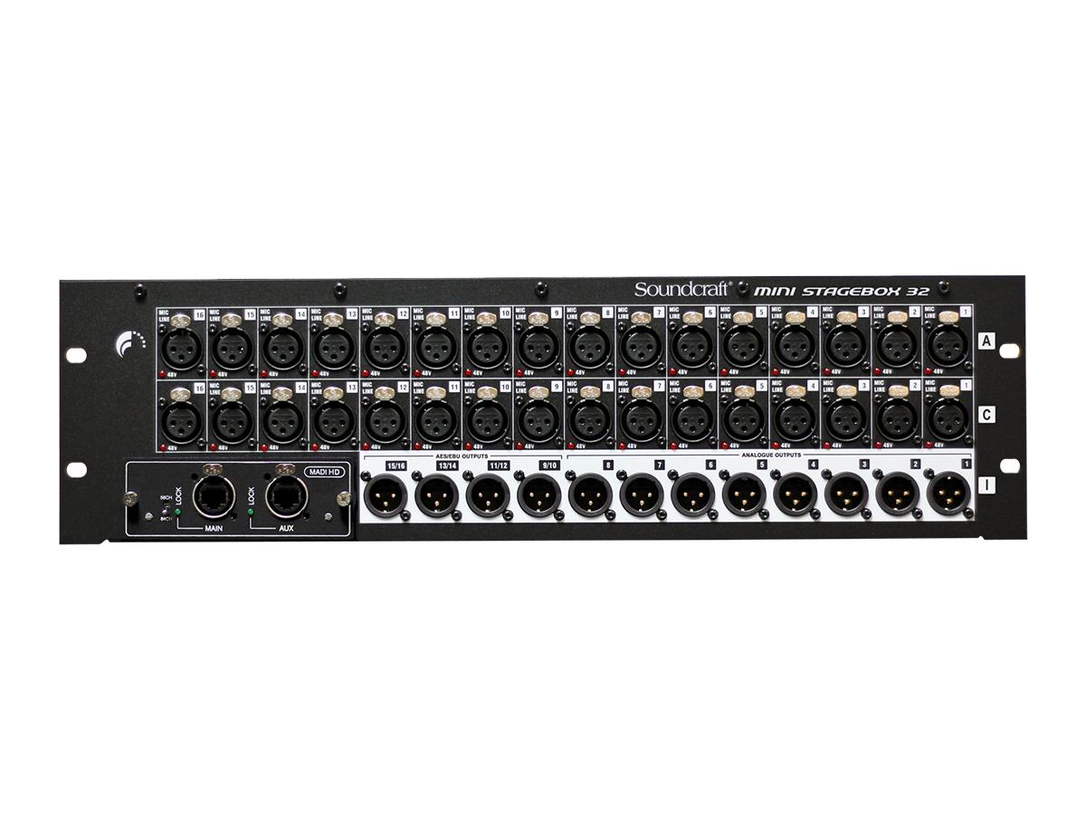 The Mini Stagebox 32R (3U) provides 32 analogue inputs and 8 analogue line outputs, with 4 pairs of AES outputs, providing a total I/O capacity of 32 inputs and 16 outputs, with the Mini Stagebox 16R (2U) model providing 16 analogue inputs and 8 line outputs making a 16 x 8 matrix. They connect to any of the Soundcraft Si Expression, Si Compact, Si Performer, Si Series and Vi Series consoles via a MADI card fitted to the option card slot.