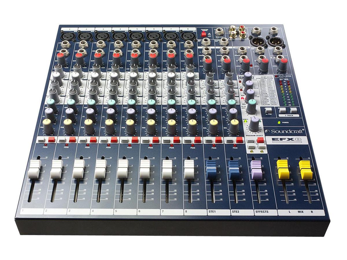 The Soundcraft EFX™ Series combines all the features of the popular Soundcraft EPM™ mixer with a built-in 24-bit, digital Lexicon® effects processor, expanding the Soundcraft low-cost, multipurpose compact range. The Effects section fits neatly into the mixers compact framework which is available in 8 or 12 mono input variants, both with 2 stereo channels and an effects send on each channel. There are 32 effects to choose from with a tap tempo function, 3 effects parameter controls and a user effects setting store facility. An effects channel level clip LED and Mute function gives the user even more flexibility.