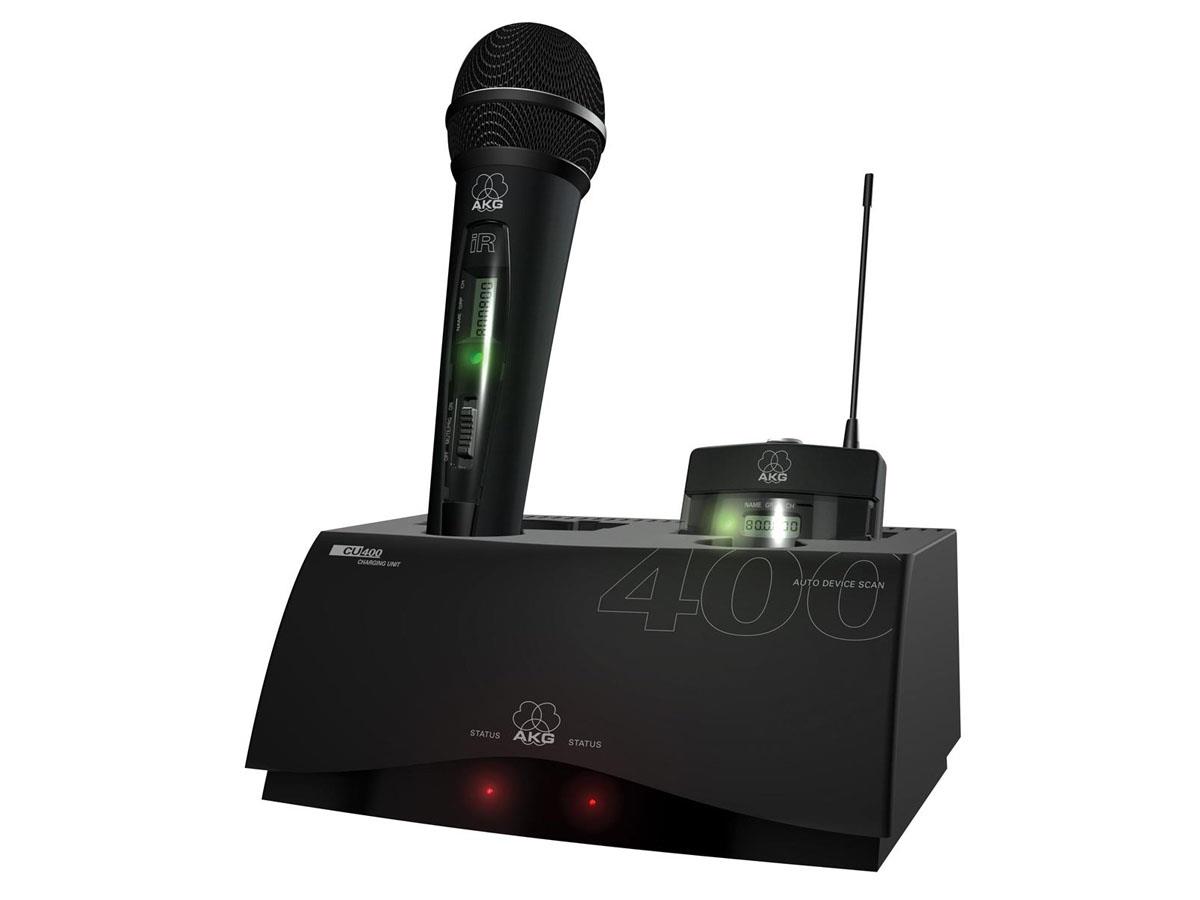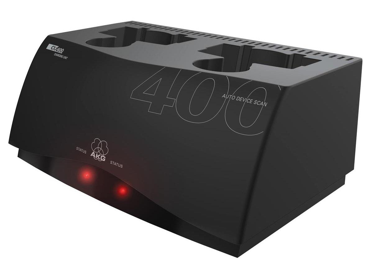 The AKG CU400 is a high-performance drop-in-style battery charger for WMS420, WMS450 and WMS470 series wireless handheld and body-pack transmitters. The charger's design and the integrated charging contacts of the transmitter conveniently eliminate the need to remove the battery before charging; simply drop the entire transmitter into the slot. The charger monitors battery voltages and temperatures during charging and automatically ends the cycle when the batteries are fully charged. The CU400 provides a status display LED for full control of the charging status.