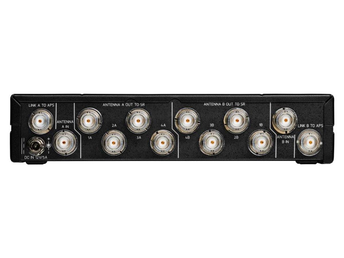Two rear panel antenna inputs provide a 10 VDC supply voltage for powering up to three active elements per antenna path. E.g. one active antenna (RA4000 B/W or SRA2 B/W) and two AB4000 antenna boosters connected to one RF input. Also located on the rear panel are two sets of four BNC antenna output connectors for feeding up to four diversity receivers and two additional antenna outputs for cascading up to three further APS4 devices.