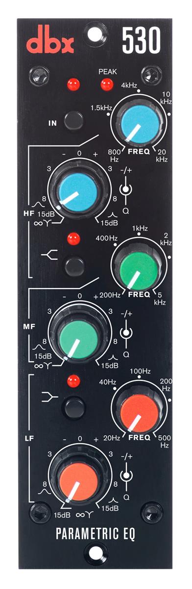 The dbx 530 Parametric EQ offers a unique degree of equalization flexibility in the popular 500 Series format. Based upon the classic dbx 905, the dbx 530 is an uncompromising equalizer offering true, fully parametric operation of all three filter bands! dbx has a much-heralded history with modular processors dating back to our 900 Series, and the dbx 530 continues that tradition.