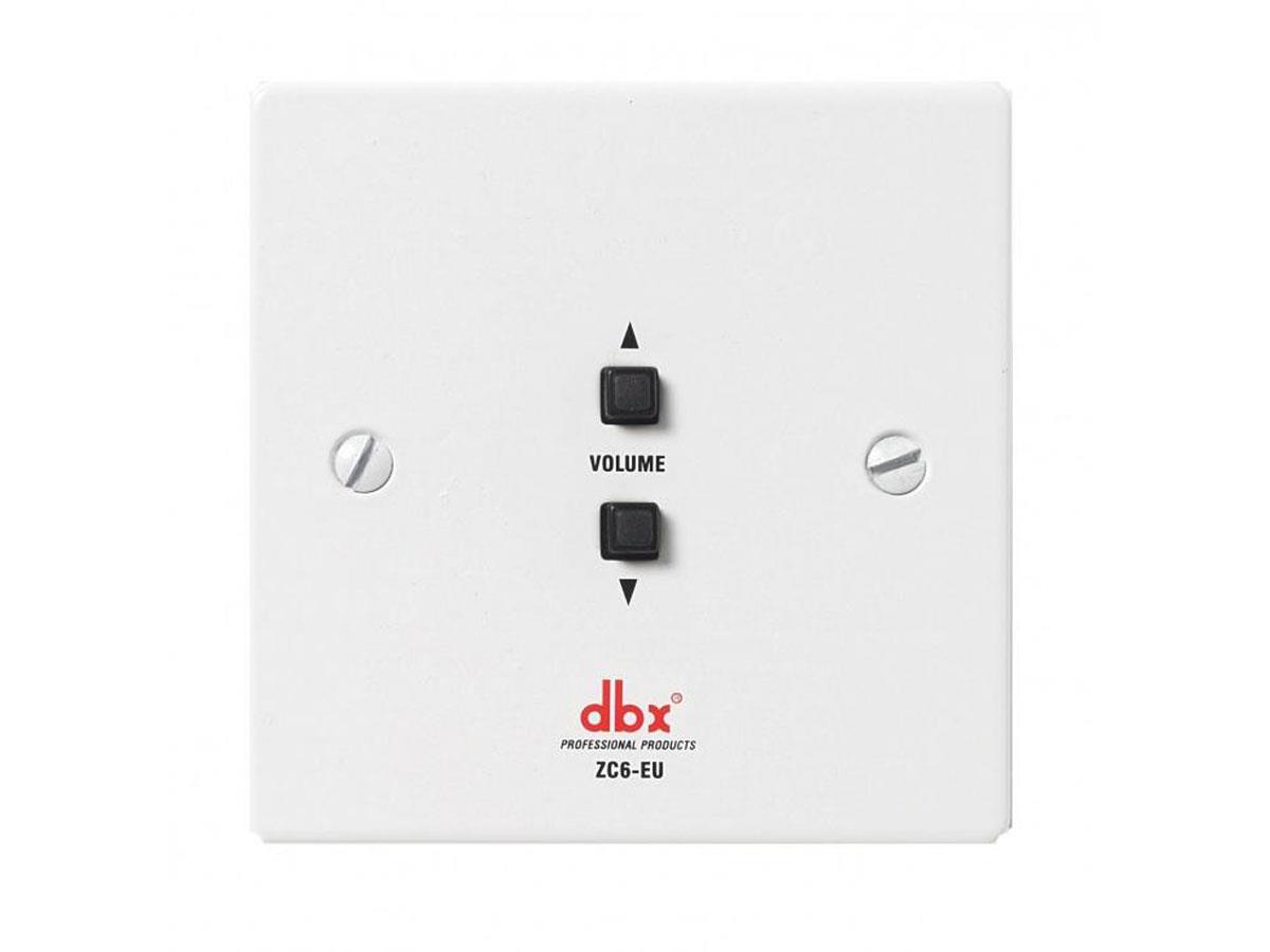 The remote device shall provide computer programmable push-button up/down volume control for the dbx® ZonePRO™ devices. The remote device shall have DIP switches allowing identification with connection to the processing device via CAT 5 cable on RJ-45 connectors. The device shall be a dbx ZC-6-EU remote controller.