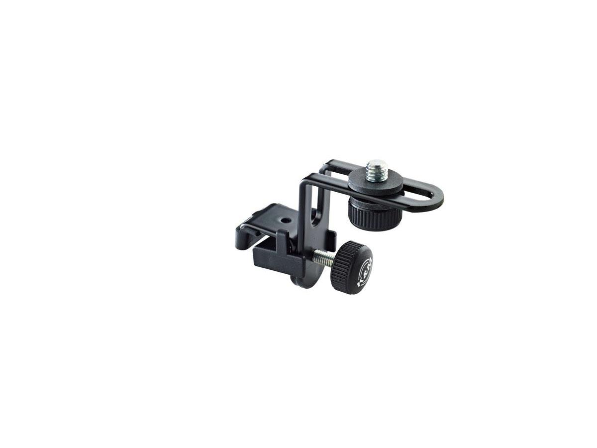 Unique, compact holder to attach microphones to drums. Easy to mount and remove. Rubber inserts absorb noise and shock. No parts to lose. Tightens securely. With 3/8" thread.