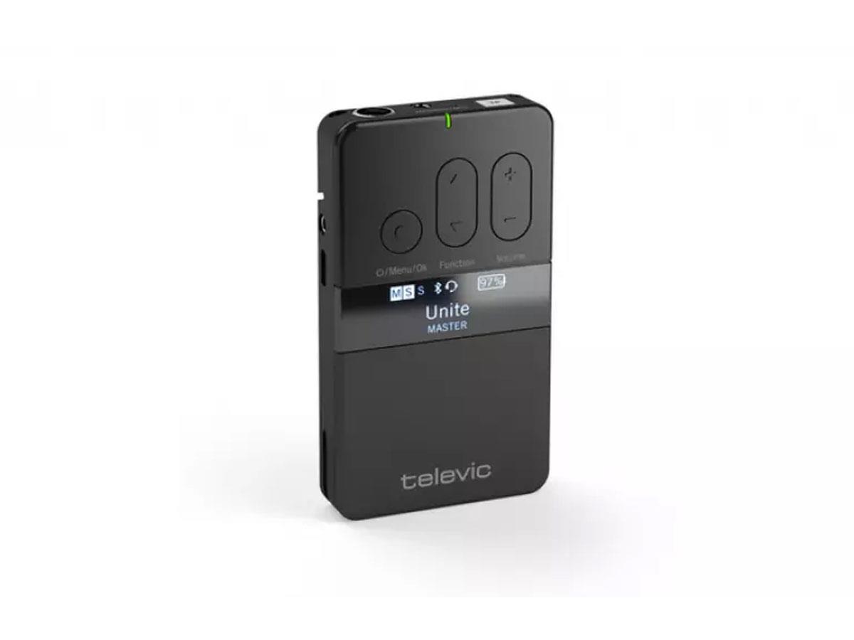 The transmitter can either be attached to clothing or worn around the neck. Its ergonomicdesign and control elements ensure simple and intuitive operation. TheOLED display menu includes numerous setting options, and meets the requirements for accessibility with raised symbols and braille on the mute button.