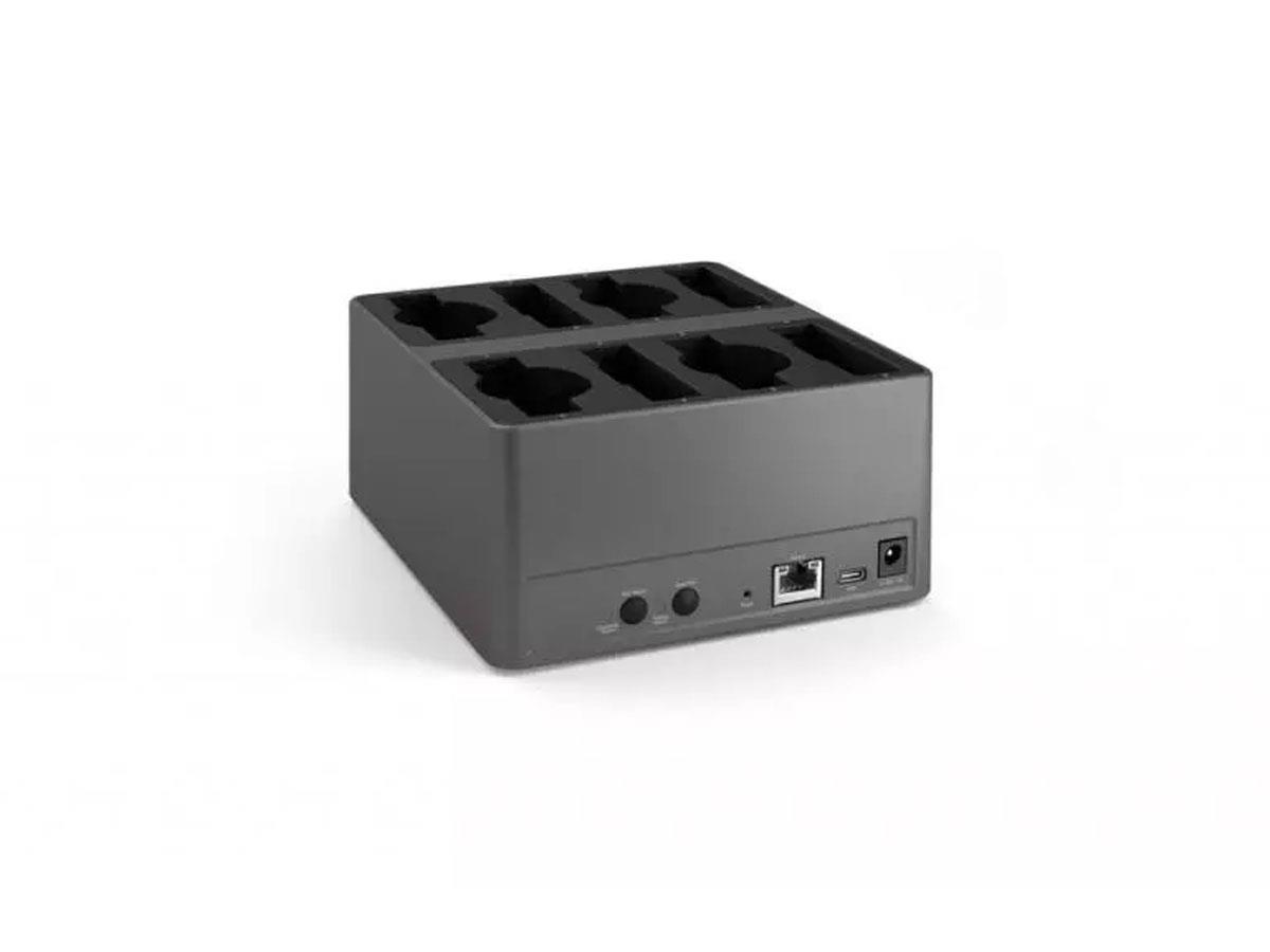 It can be integrated into a network by using the Ethernet connection. With the Unite Manager software, the desktop charger can be monitored remotely. It can also be attached to a table top via two holes at the bottom. The charger provides a maximum of eight charging compartments, four of them are compatible with the Unite TH handheld transmitter.