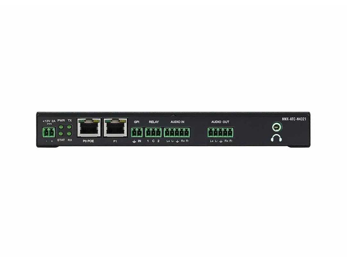 The NMX-ATC-N4321 Audio Transceiver is an audio-over-IP solution that both sends and receives two-channel balanced or unbalanced audio over IP. Simply connect a balanced audio input into the IN port and it's converted to IP packets that are switchable and routable just like data or voice. The balanced audio output receives an audio-over-IP stream and decodes to analog while preserving audio fidelity.