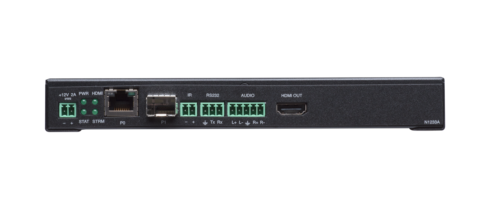 The new NMX-DEC-N1233A model features improved digital pixel reproduction and reduces latency to an industry leading 10-ms for gigabit links. Packetized video streams not only remain visually lossless throughout distribution, they also arrive instantly. It has separate HDMI and VGA/RGB inputs, supports PoE, AES67, and has a separate SFP port. The SFP fiber path allows visually lossless video to be routed on a fiber-only network and extend signals beyond the reach of category cable. Added USB connectivity will enable users to extend USB over IP for touch-enabled and KVM applications.