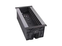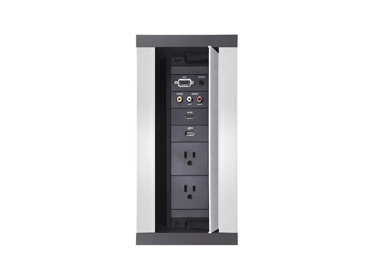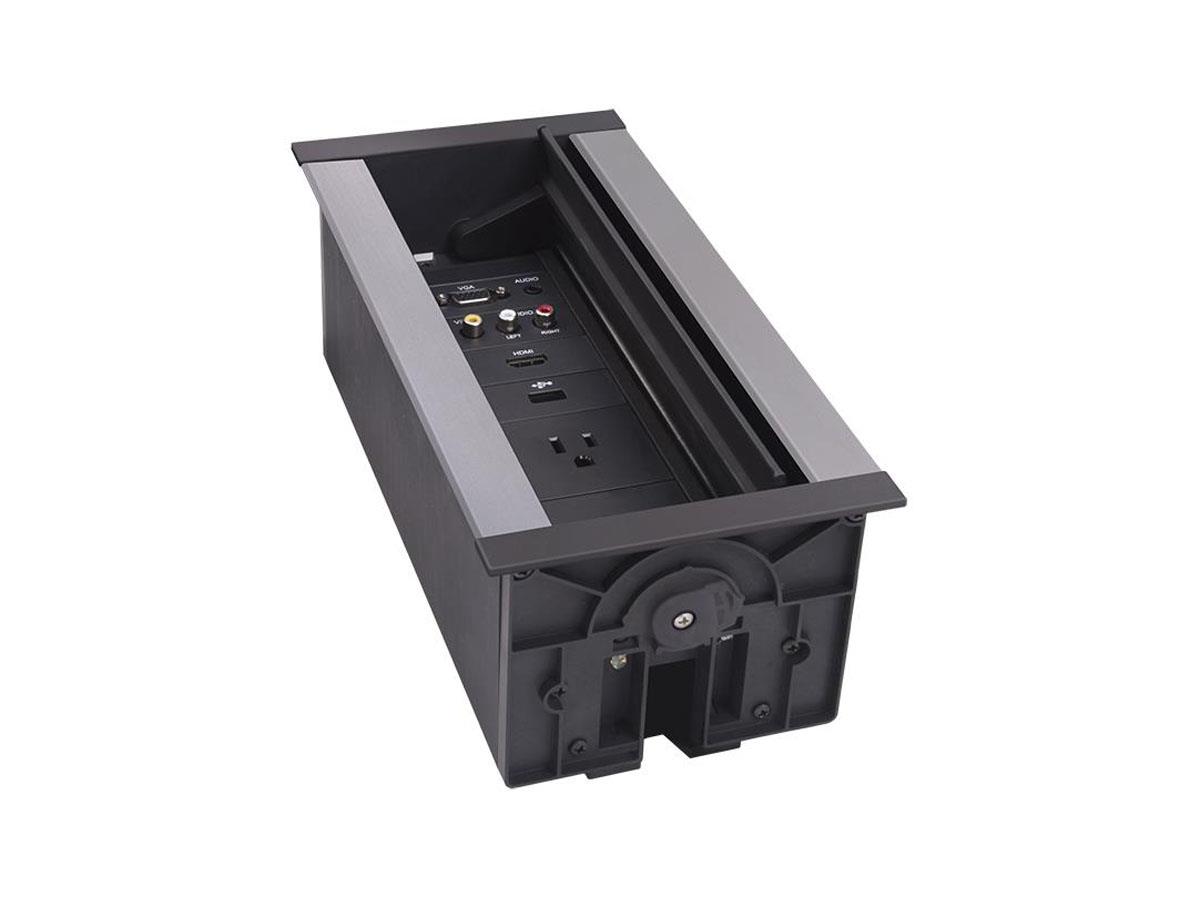 The HPX-900 / HydraPort® 9 Module Connection Port is a modular AV table box for connecting mobile devices to projectors or displays in a conference room or classroom. This sleek, flush-mount table box is typically installed in a conference room or classroom table, featuring a uniquely-designed lid that conveniently opens in both directions to provide a clean, unobtrusive look.